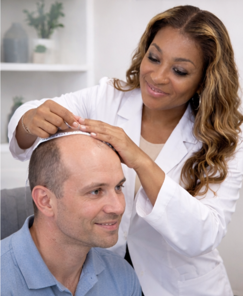 Discreet hairlines and men's units for medical hair loss, traction, and post-surgical recovery — refined and undetectable.